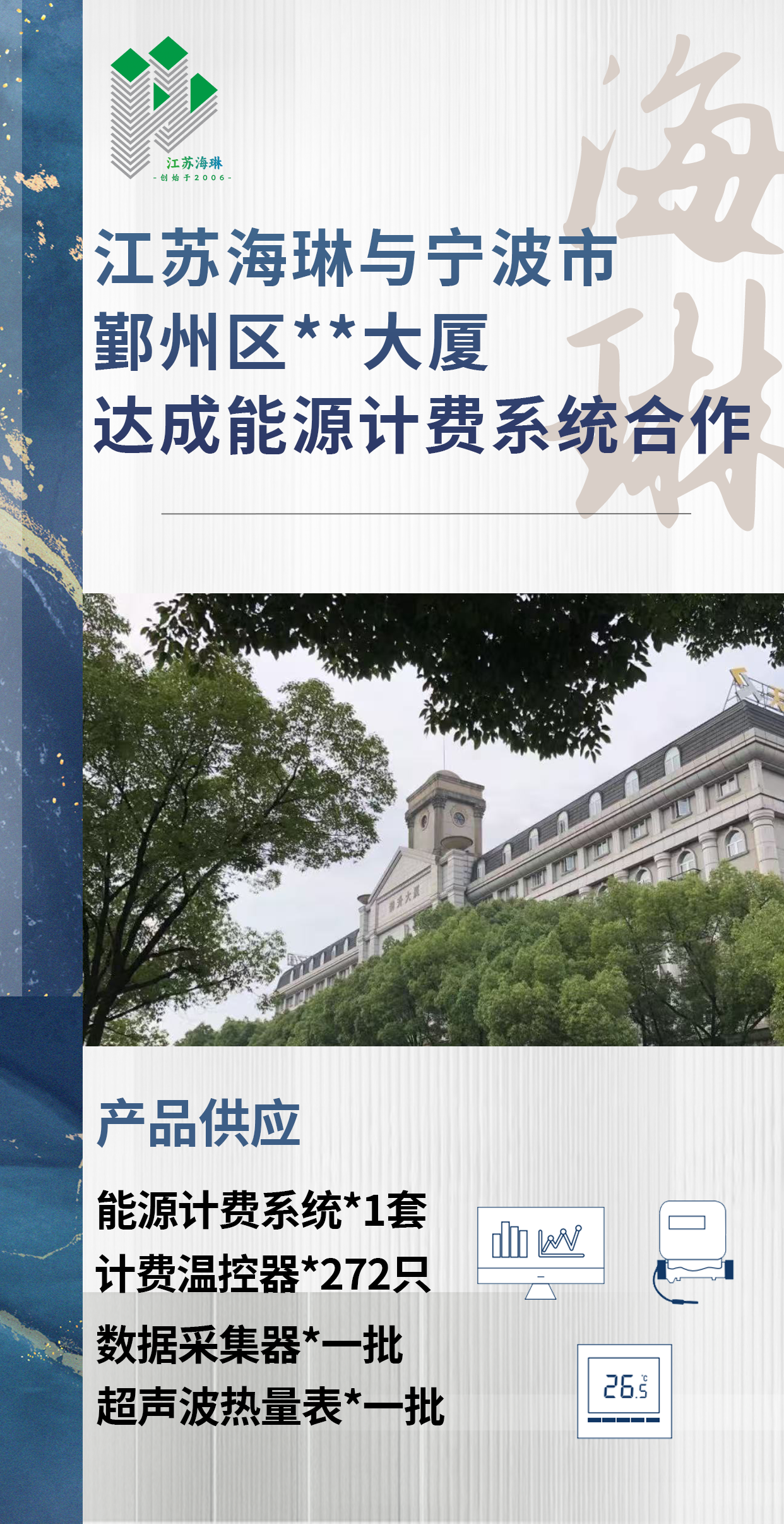 江苏海琳与宁波市鄞州区**大厦达成中央空调计费系统合作;相比较传统按面积分摊的空调费用结算方式,中央空调计费系统按空调开启实际使用量收取费用,多开多付,少用少付,不用空调则无需支付费用。传统的面积分摊收费方式,开和不开空调费用一样,既然费用一样,那就大家都开空调,导致空调运行费用居高不下;计费系统公平收费、准确计量,收费有凭据,可以有效减少业主和物管之间的矛盾。